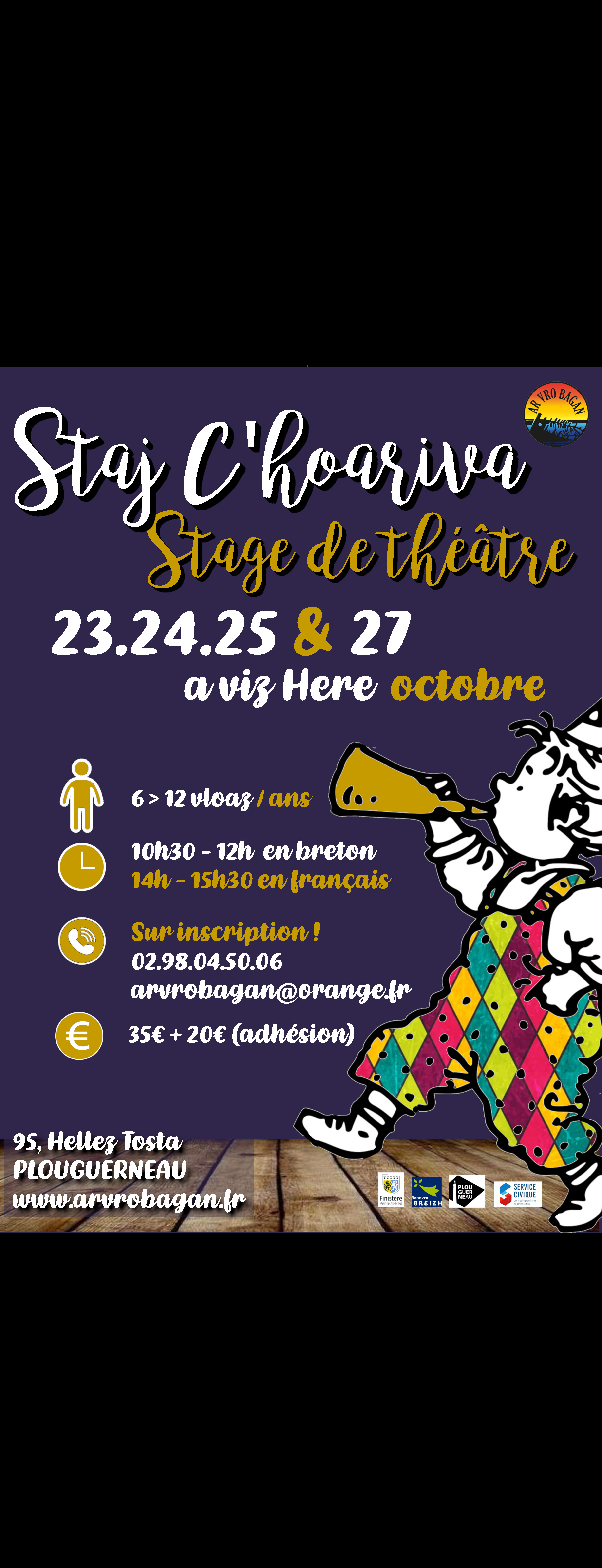 Ar Vro Bagan propose sur quatre jours un stage de théâtre pour enfants de 6 à 12 ans. Le stage se conclut par une représentation sur scène devant les parents et amis.